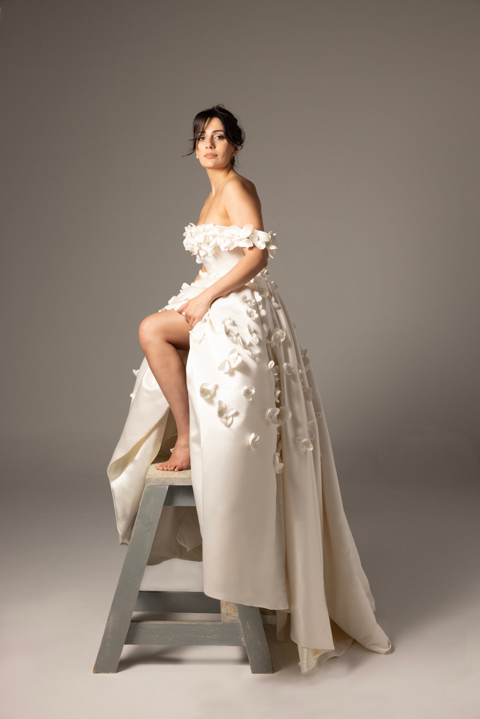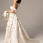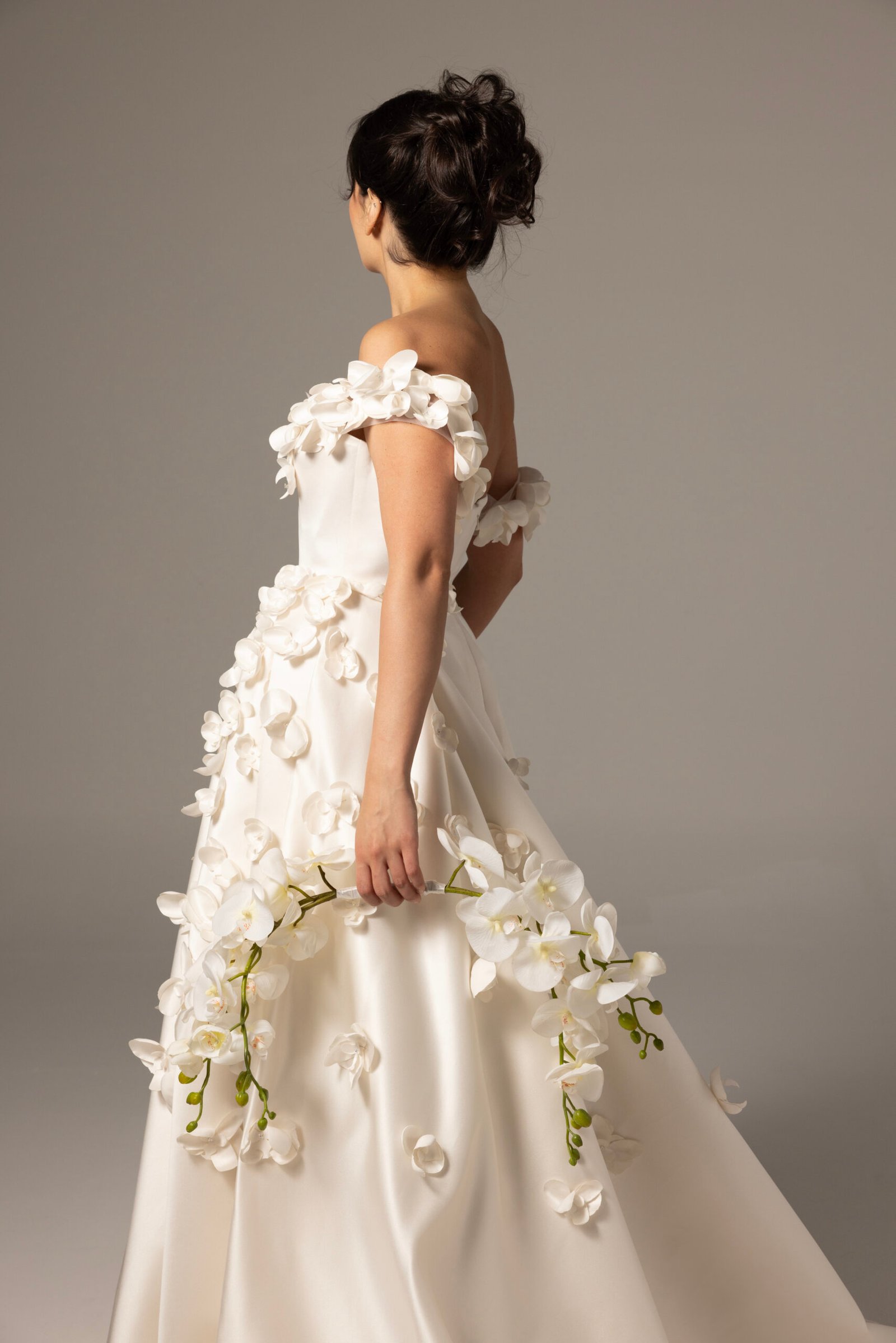 This gown made from satin duchess with handmade 3D orchid flowers, complemented by a skirt that exudes elegance and romance.