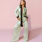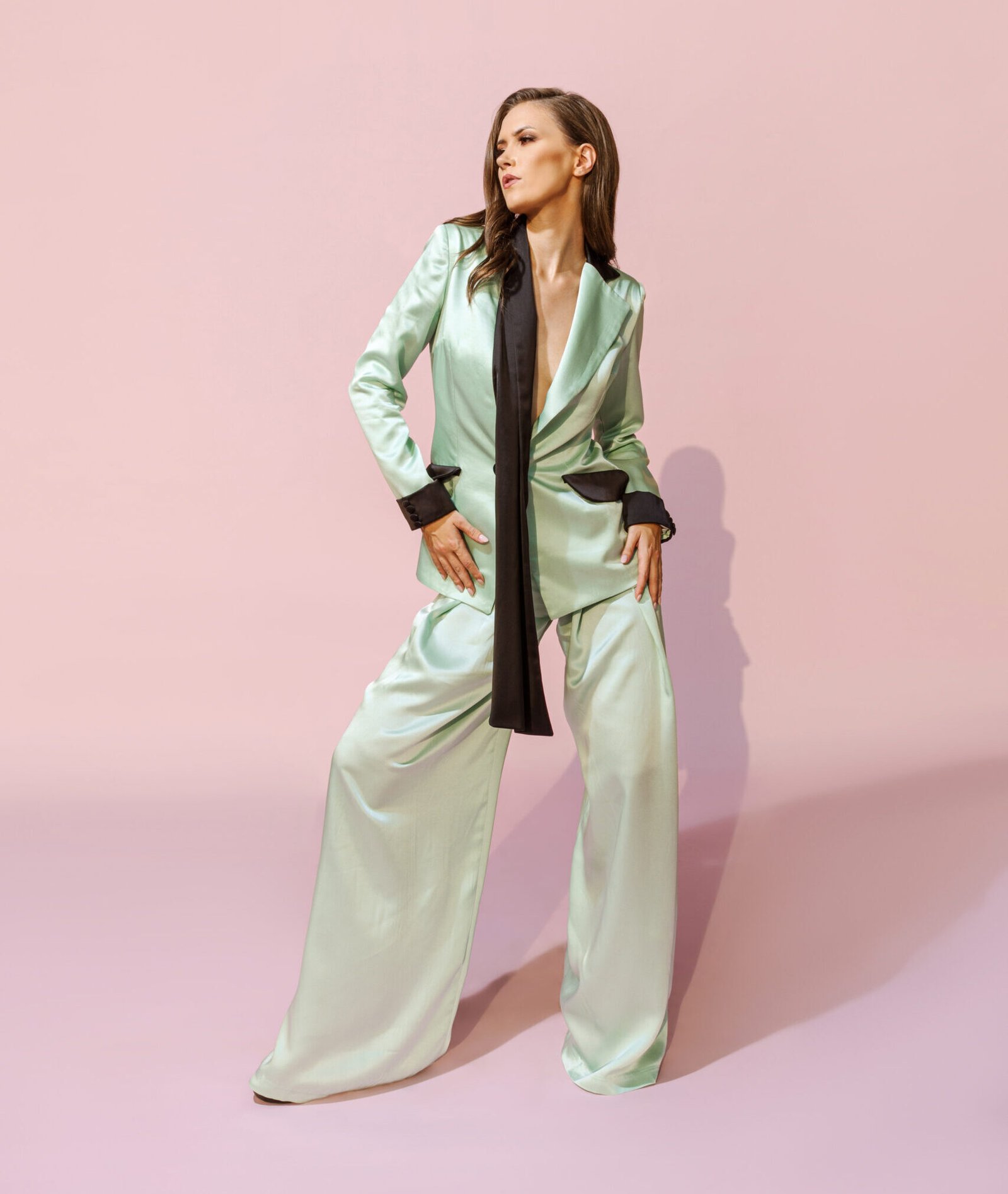 A sharply tailored two-piece set in a fresh mint-aqua tone, The blazer features bold black contrast detailing along the lapel, cuffs, and pocket flaps, creating a crisp graphic edge. A fluid black scarf element drapes from the neckline, adding movement and a touch of softness against the clean lines.