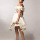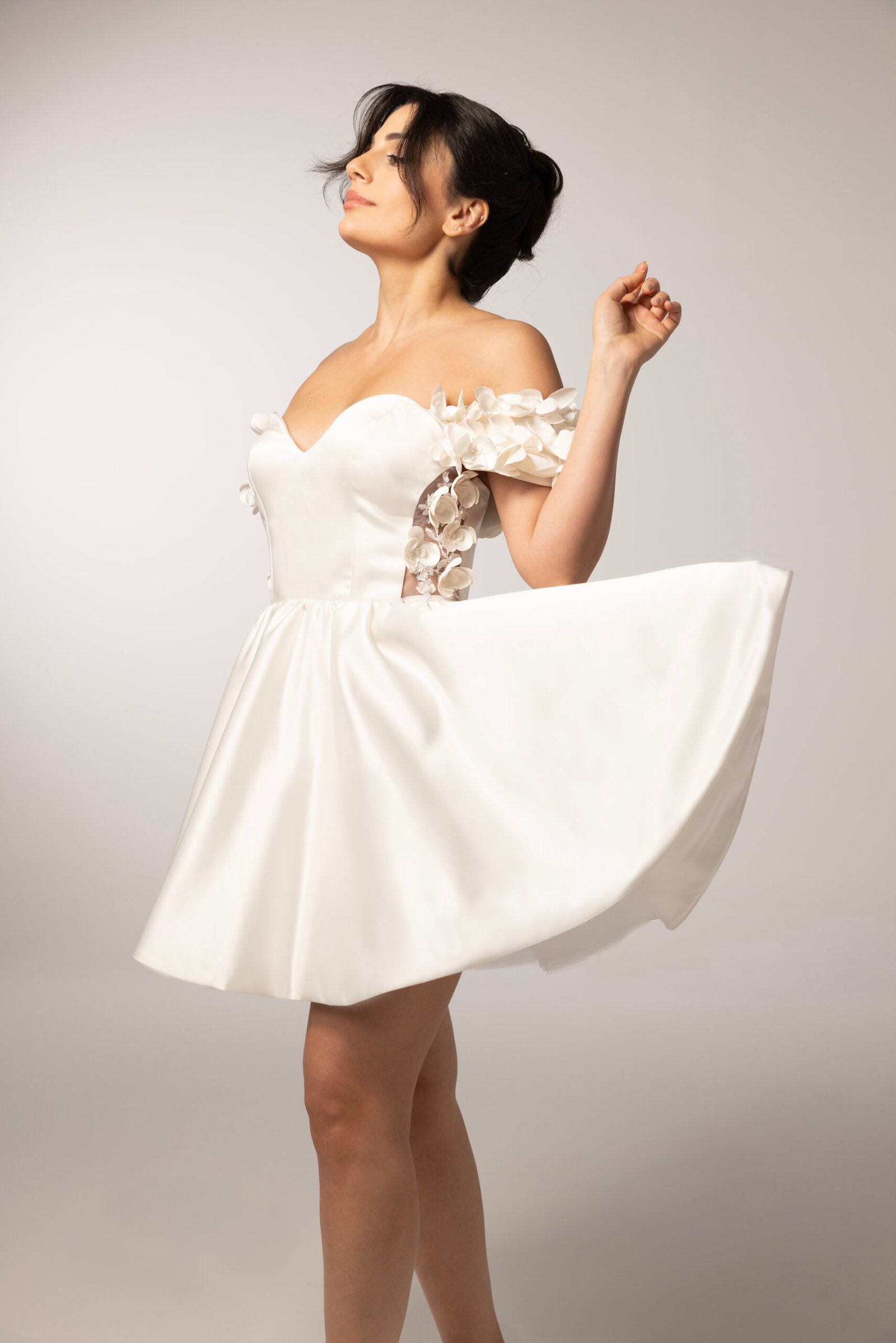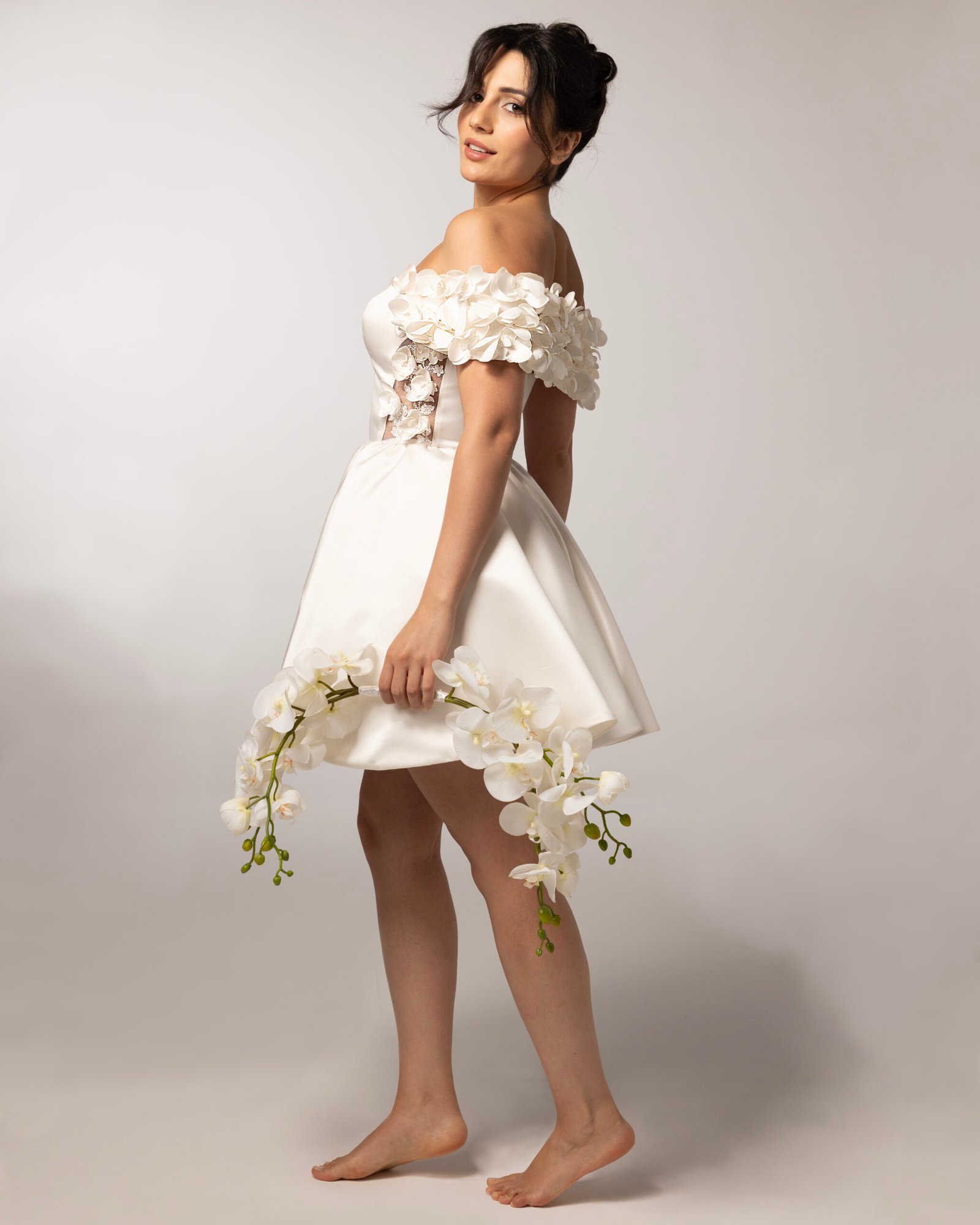 Off-the-shoulder mini dress in creamy ivory satin duchess, with delicate 3D orchid floral appliqués cascading along the shoulder and trace the bodice sides.